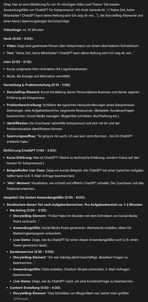 Erstelle eine Gliederung für ein 10-minütiges Video zum dem gewählten Thema mit der Hook Variante [Nr]. Berücksichtige dabei Storytelling-Elemente und einen klaren Spannungsbogen.