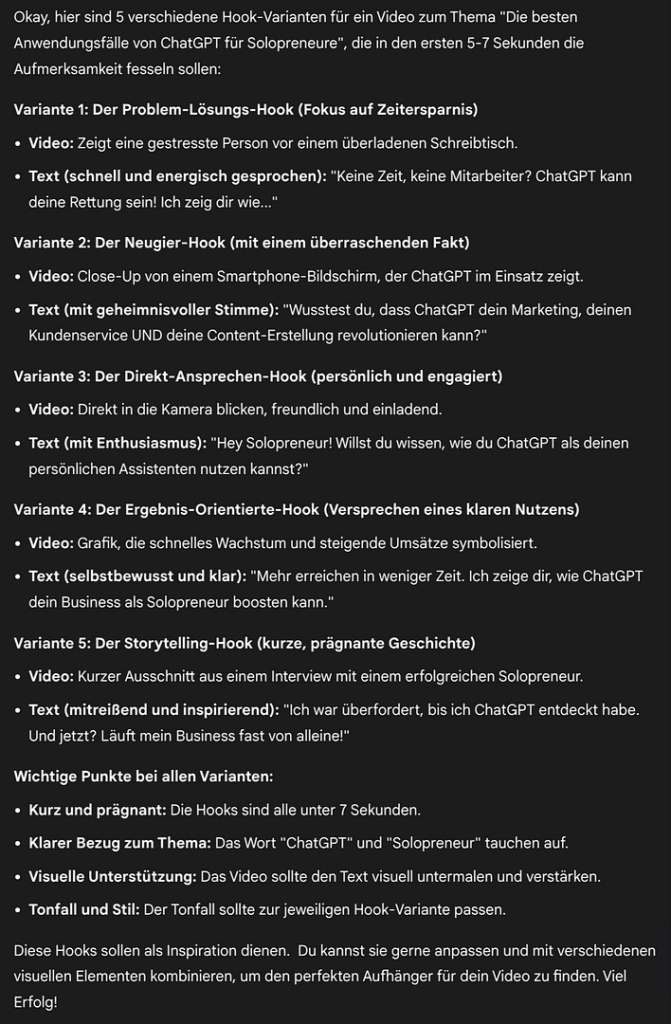 3. Mit diesem Wissen entwickeln wir die Hook des Videos. Dazu fragen wir Gemini: